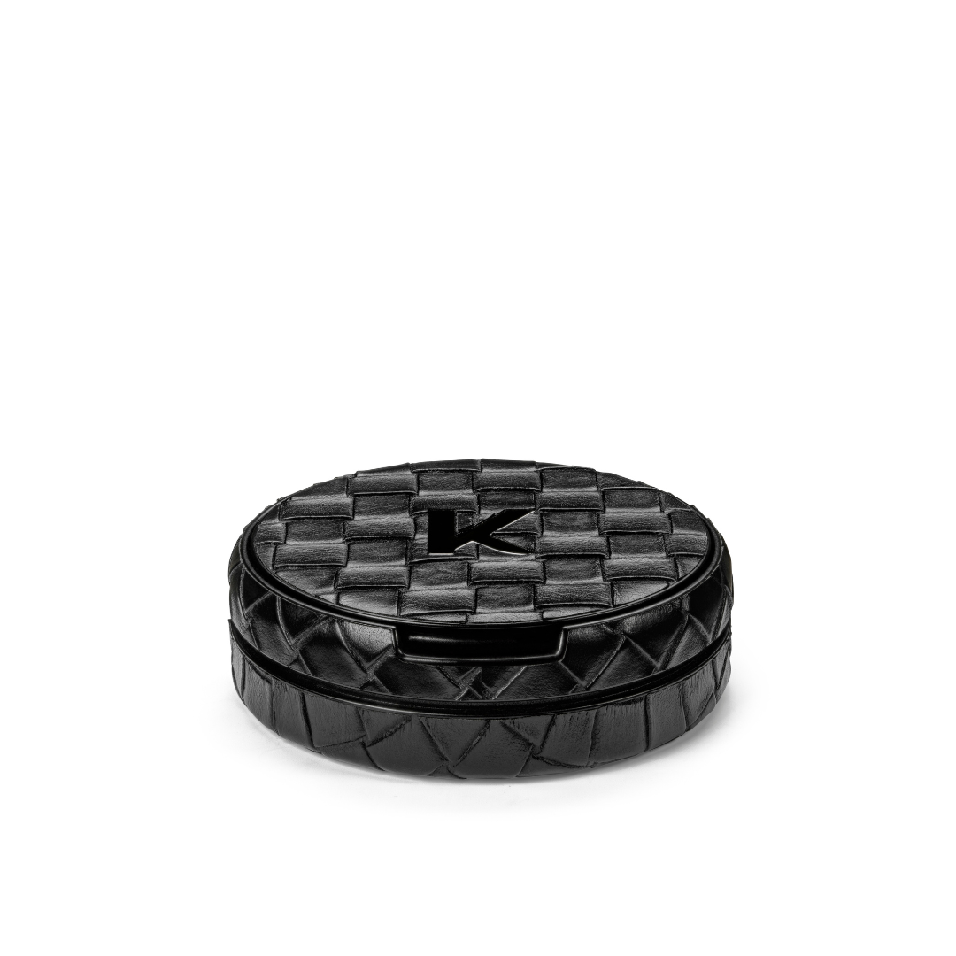 Η Kelly White Premium Case Black είναι μια κομψή, premium κουτάκι με all-black woven (ανάγλυφη πλεκτή) υφή και minimal λογότυπο “K”. Σχεδιασμένη για να προστατεύει και να αναβαθμίζει την εμφάνιση της στρογγυλής συσκευασίας σου, ιδανική για καθημερινή χρήση, δώρο ή συλλογή.